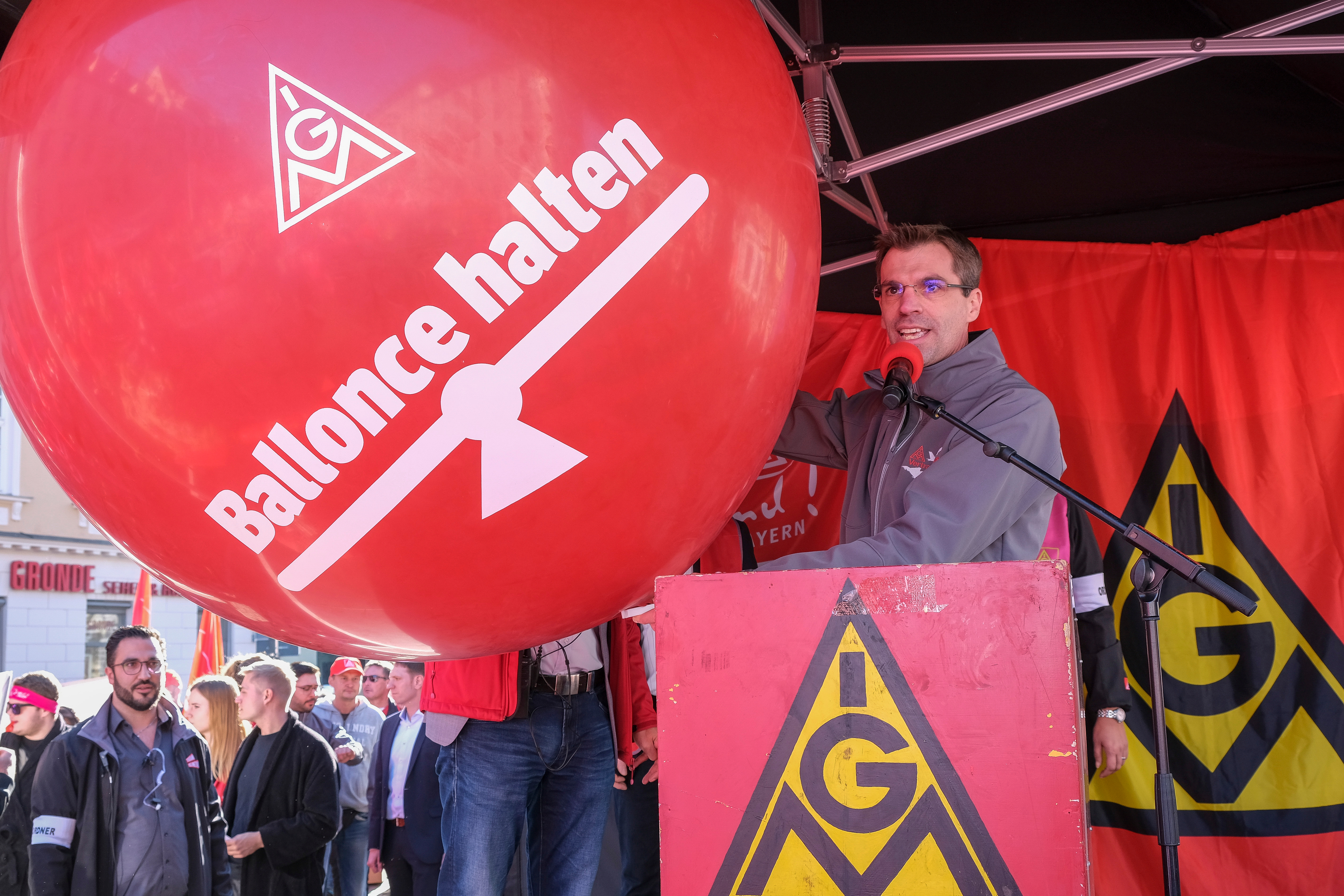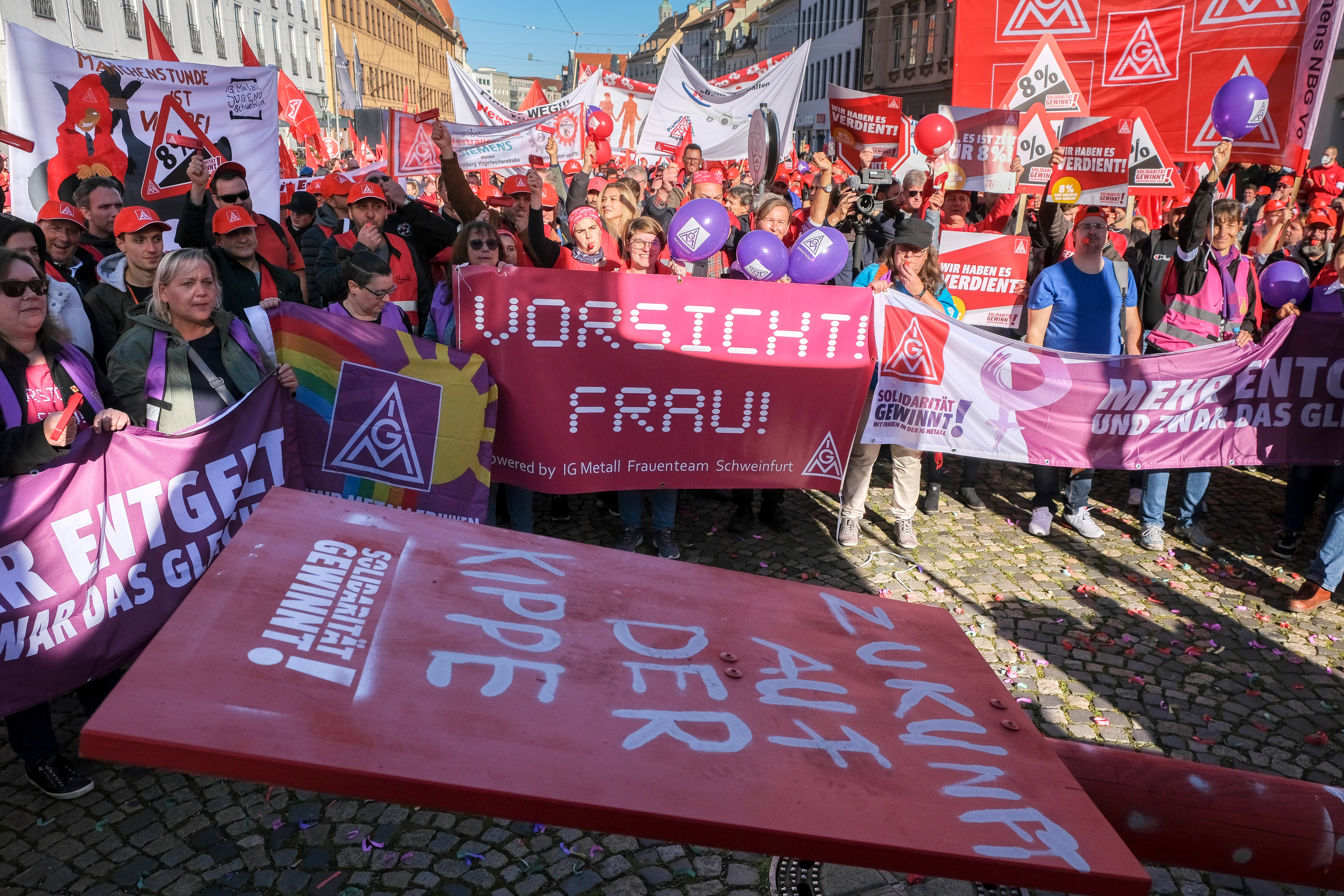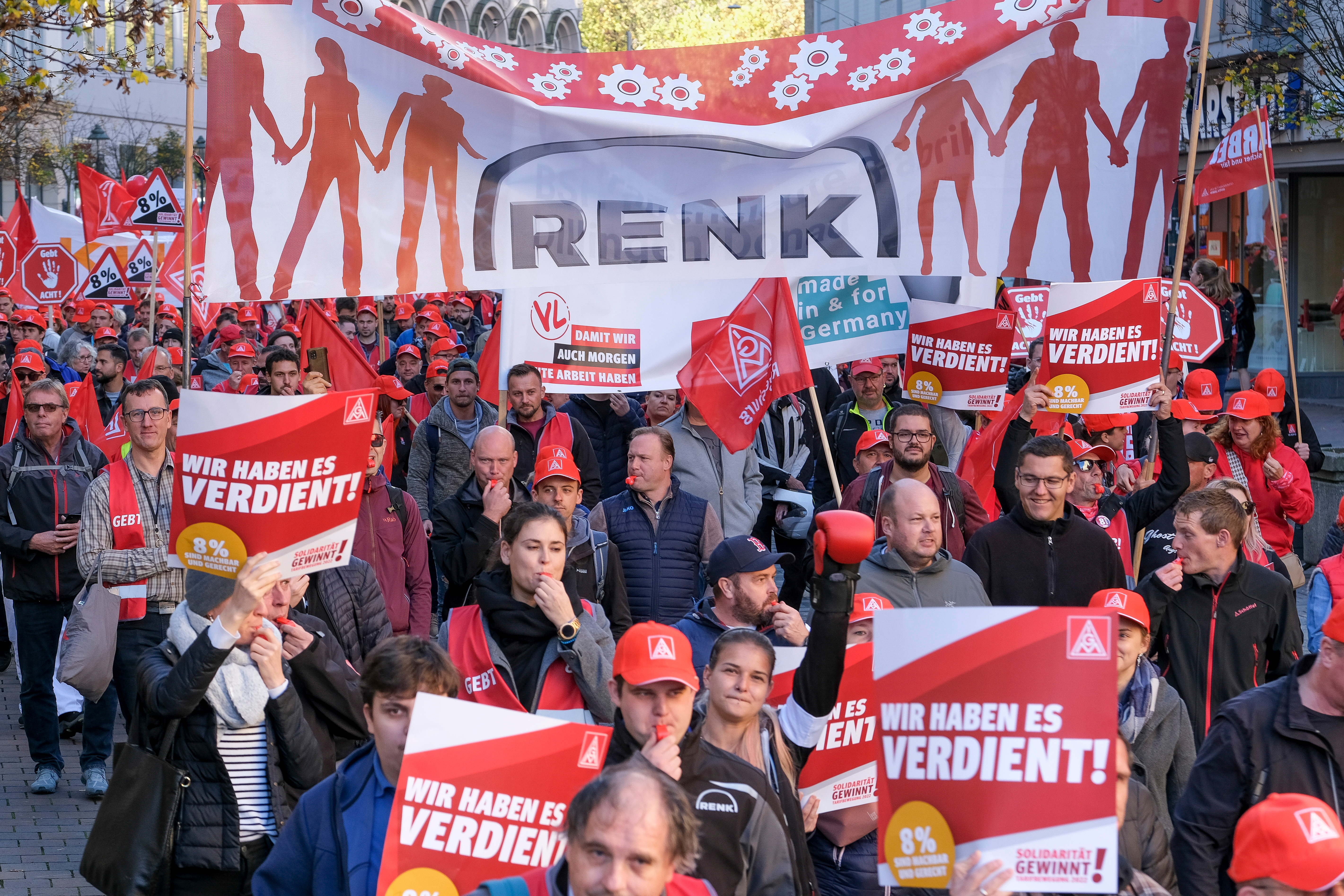 4.000 Beschäftigte haben am 27. Oktober in Augsburg bei einem Demonstrationszug und einer Kundgebung vor der 3. Tarifverhandlung für die Metall- und Elektroindustrie lautstark deutlich gemacht, dass sie bereit sind, für die Durchsetzung ihrer Tarifforderung zu kämpfen. Mit einem viel zu schwachen Angebot haben die Arbeitgeber heute die Chance versäumt, innerhalb der Friedenspflicht einer Lösung näherzukommen. Eine prozentuale Entgelterhöhung hat der Arbeitgeberverband vbm lediglich in Aussicht gestellt – innerhalb einer Laufzeit von 30 Monaten und ohne eine Zahl zu nennen.