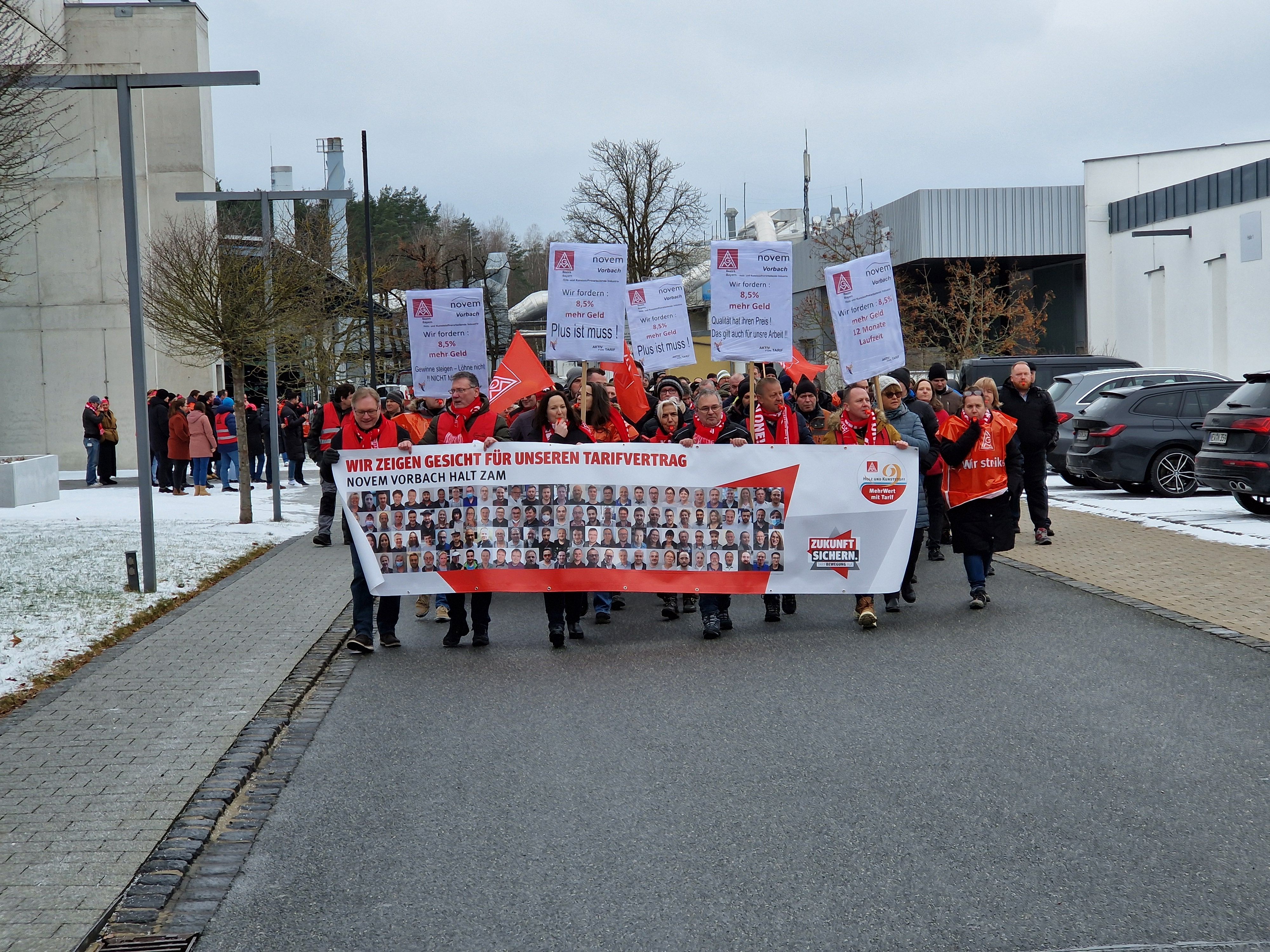 450 Beschäftigte aus neun Betrieben der bayerischen holz- und kunststoffverarbeitenden Industrie haben am 7. Dezember 2023 in Straubing mit einer Demonstration vor der ersten Tarifverhandlung Druck auf die Arbeitgeber gemacht. Beteiligte Betriebe: Heyco (Tittling), Sanipa (Treuchtlingen), Novem Car Interior (Vorbach), Jeld-Wen (Oettingen), Bayerwald (Neukirchen), Völkl (Straubing), Peri (Weißenhorn), Steelcase (Rosenheim) und Hamberger (Stephanskirchen).